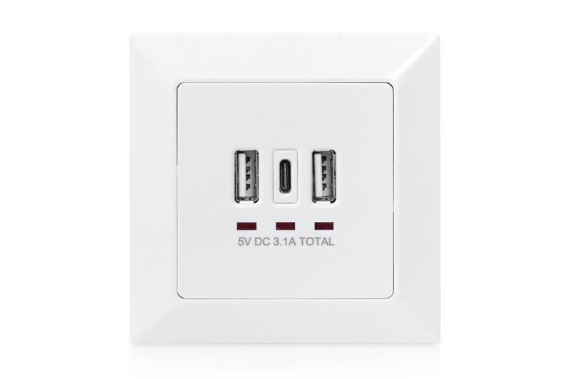 Smartphones und Tablets aufladen direkt an der Wanddose! Mit der DIGITUS® USB Lade-Dose können Sie sogar 3 Smartphones oder Tablets zeitgleich aufladen. Laden Sie ein USB-C-Gerät mit bis zu 14 W (5 V / 2,8 A) und zwei USB A-Geräte mit bis zu 14 W (5 V / 2,8 A). Laden Sie beispielsweise gleichzeitig Ihr Smartphone und Ihr Tablet mit insgesamt 15,5 W verfügbarer Ladeleistung. Schützen Sie sich und Ihre Familie durch den eingebauten elektronischen Kurzschluss- und Überlastschutz der USB-Ports. Rüsten Sie Ihre vorhandene Elektroinstallation auf und kommen Sie in den Genuß, jederzeit Ihre USB-Geräte direkt an der Wanddose aufladen zu können.