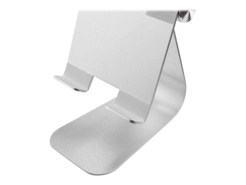 Dank der offenen Konfiguration bleibt der Ladeanschluss zugänglich und die Ladekabel können zur Rückseite des Ständers geführt werden. Durch das leichte, kompakte Design eignet sich der Ständer ideal, um ihn überall hin mit zu nehmen. Die rutschfesten Silikonkissen und die Sicherheits-Leisten sorgen für eine solide Positionierung Ihres Tablets.