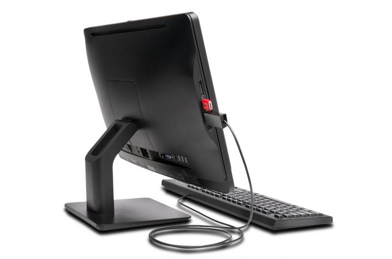 Blockiert mehrere nebeneinander liegende Anschlüsse: einen mit einem aktiven USB-Gerät wie etwa Tastatur/Maus mit einem Schloss, sodass die nicht blockierten USB-Geräte weiterhin sicher genutzt werden können