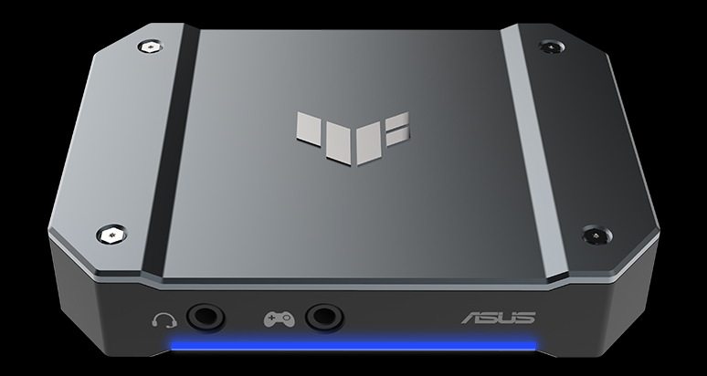 Die Vorderseite der ASUS TUF Gaming Capture Box wird von einer RGB-Leiste beleuchtet, die den Funktionsstatus anzeigt.