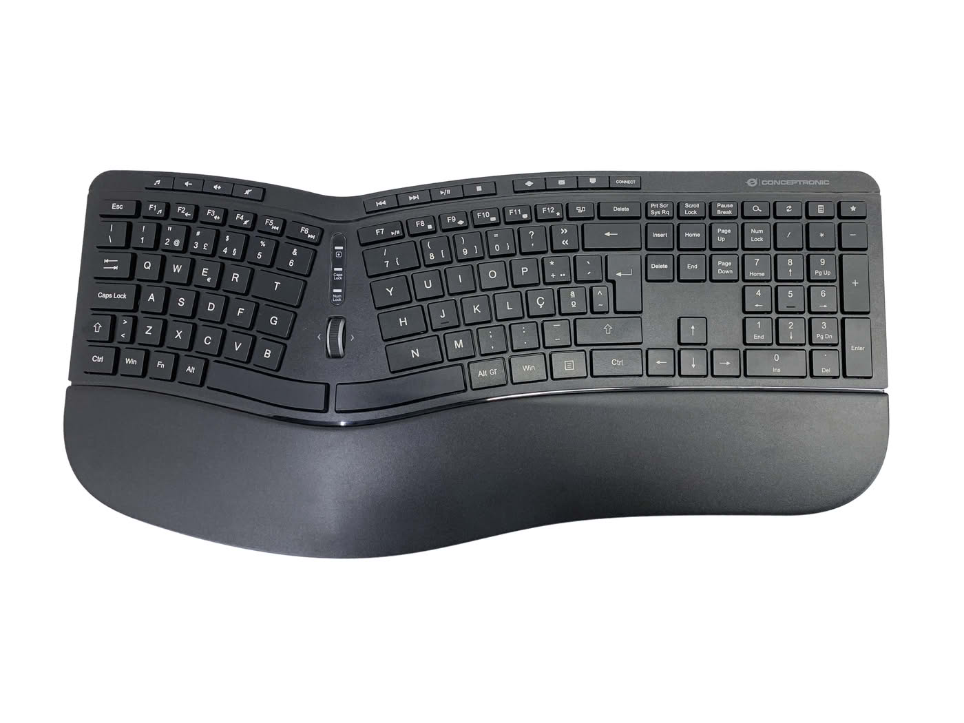 - Geteiltes Tastaturlayout mit integriertem Scrollrad