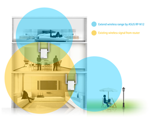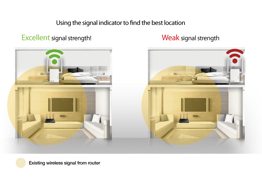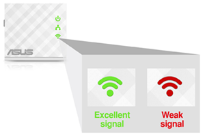 Um die besten Ergebnisse zu erzielen muss sich der RP-N12 innerhalb der Reichweite eines stabilen Router-Signals befinden und sollte zwischen dem Router und dem Bereich platziert werden, in dem eine bessere Signalabdeckung benötigt wird. Der ASUS RP-N12 bietet die höchste Performance, wenn er ein starkes WLAN-Signal vom Router erhält. Die Signalstärke kann an der Frontseite des Repeaters abgelesen werden.