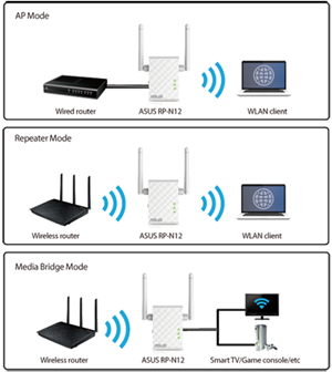 Der ASUS RP-N12 verfügt über zwei zusätzliche komfortable Modi und bietet somit weitere flexible Nutzungsmöglichkeiten. Er lässt sich nicht nur als WLAN-Repeater, sondern auch als oder als Access Point (AP) oder Media-Bridge einsetzen. Im AP-Modus kann er mit jedem kabelgebundenen Netzwerk verbunden werden — bspw. mit der Internetverbindung eines Hotels — um so einen persönlichen Wi-Fi-Hotspot zu erstellen. Über diesen können dann Geräte wie Notebooks, Handys oder andere Wi-Fi-Geräte auf die Internetverbindung zugreifen. Im Media-Bridge-Modus lässt er sich mit jedem netzwerkfähigem Gerät verbinden, wie bspw. Smart-TV-Geräte, Multimediaplayer, Spielkonsolen oder PC-Systeme, um diese mit WLAN-Fähigkeiten auszustatten. Somit lässt sich lästiges Kabelgewirr vermeiden!