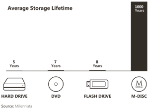 M-Disc ist ein neuer Standard, bei dem Daten in eine patentierte, steinähnliche Schicht eingraviert werden. Dies ermöglicht eine Speicherung von bis zu 1000 Jahren. Es gibt M-Discs im DVD (4,7GB) und Blu-ray (25GB und BD-R 100GB) Format.