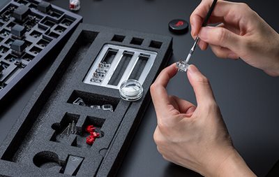 Das ROG Azoth enthält ein komplettes Set an Werkzeugen für die DIY-Schalterschmierung. Das Kit enthält einen Schalteröffner, einen Tastenkappenzieher, einen Schalterzieher, eine Schmierstation, ein Pinsel und eine Flasche Krytox™ GPL-205-GD0 Schmiermittel.