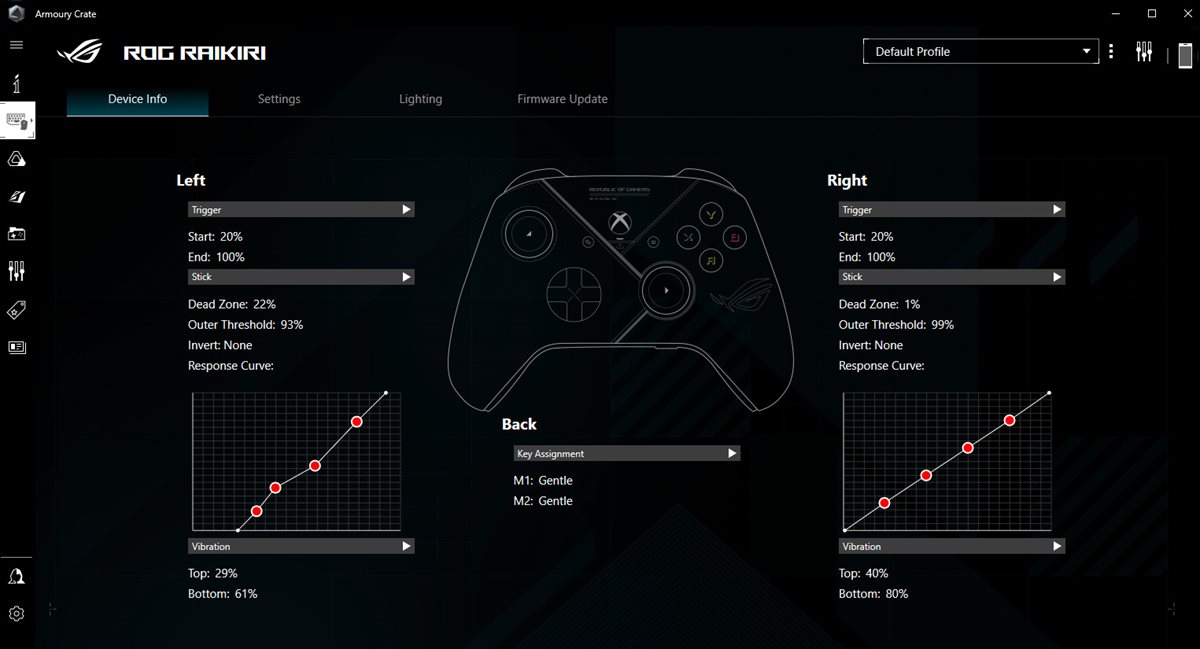 Mit der Armoury Crate kannst du Tasten zuweisen, die RGB-Aura-Beleuchtung, die Vibrationsstärke, die Totzone des Triggers und die Reaktionskurven des Joysticks anpassen. Es ist einfach, die Steuerung für jedes Spiel anzupassen.