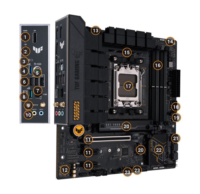 TUF GAMING B650 Mainboards erreichen mit der neuesten Version von PCI Express ein neues Leistungspotenzial, während ein ganzes Arsenal an USB-Anschlüssen, darunter zwei Typ-C® Anschlüsse, die Kompatibilität und Bandbreite noch weiter erhöht.