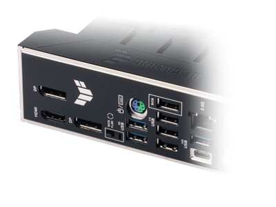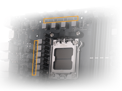 1. Vergrößerter VRM-KühlkörperDie große Oberfläche dieses Kühlkörpers bedeckt die VRMs und Spulen, um die Wärmeableitung zu verbessern. 2. Optimiertes M.2-Kühlkörperdesign Ein M.2-Steckplatz verfügt über einen eigenen Kühlkörper, der die M.2-SSD auf optimaler Betriebstemperatur hält, um eine konstante Leistung und Zuverlässigkeit zu gewährleisten.