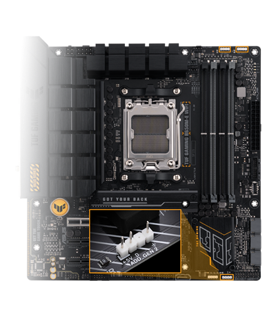 Die TUF GAMING B650 Mainboards verfügen außerdem über einen PCIe® 5.0 M.2-Steckplatz für die schnellsten Datenübertragungen von bis zu 128 Gbit/s* und alle M.2-Steckplätze unterstützen NVMe™ RAID-Konfigurationen, um die neuesten verfügbaren Geschwindigkeiten zu nutzen.