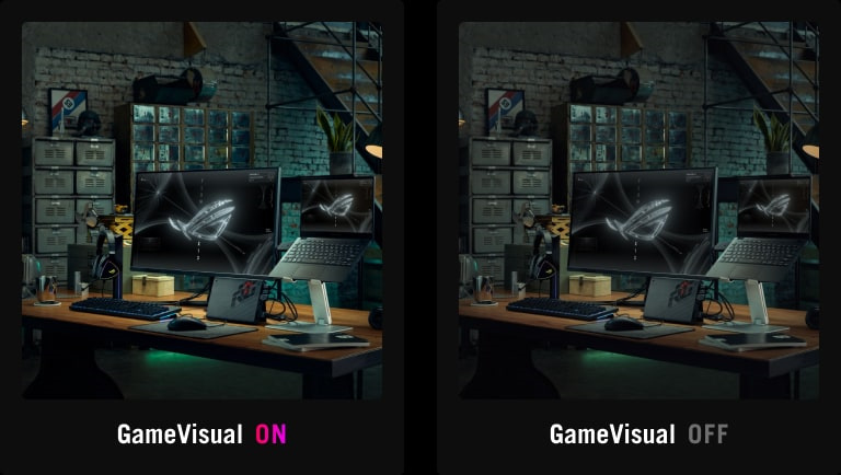 Ein Vergleich der sRGB-Ansicht auf dem ROG Swift PG32UQXR, mit und ohne GameVisual