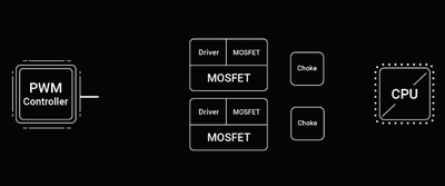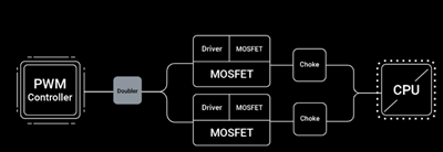 Jede VRM-Komponente dient einem bestimmten Zweck. PWM-Controller und Phasen-Doubler steuern die Schaltung, und die Power Stages übernehmen die elektrische und thermische Schwerstarbeit. Die Power Stages haben einen niedrigen RDSON-Wert, um die Schalt- und Leitungsverluste zu reduzieren und so die thermische Belastbarkeit zu verbessern. Die MOSFETs in den Power Stages erzeugen die meiste Wärme, da sie für die Spannungsumwandlung und die Versorgung der CPU über den 12-Volt-EPS-Anschluss verantwortlich sind.