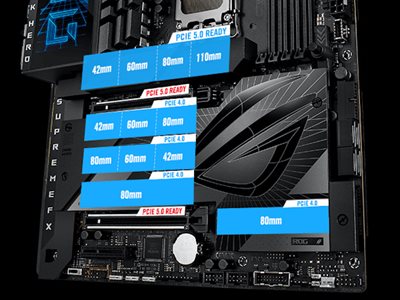 Das ROG Maximus Z790 Dark Hero verfügt über fünf integrierte M.2-Steckplätze, von denen einer PCIe® 5.0-fähig ist und blitzschnelle 16 GB/s bietet, während die anderen immer noch beeindruckende 8 GB/s über PCIe® 4.0-Schnittstellen bieten. Erweiterungssteckplätze Die beiden x16-Erweiterungssteckplätze sind mit PCIe® 5.0 ausgestattet und bieten unglaubliche Geschwindigkeiten von bis zu 64 GB/s für kompatible Geräte. Um den massiven Grafikkarten standzuhalten, sind sie außerdem mit SafeSlot-Rückhalteklammern geschützt und der obere Slot lässt sich dank des Q-Release-Knopfes leicht lösen.