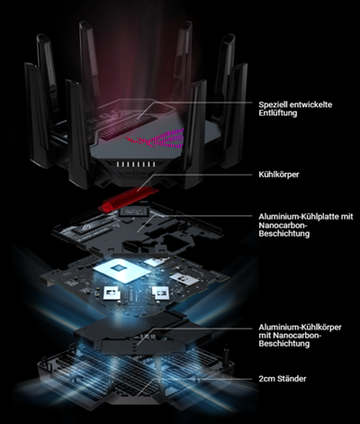 Hitze kann die Leistung beeinträchtigen. Der ROG Rapture GT-BE98 verfügt über eine 30 % dickere Aluminiumplatte auf der Oberseite*, eine gestrahlte Nanocarbonschicht und einen zwei Zentimeter hohen Standfuß. In Verbindung mit einer speziell entwickelten Entlüftung und einem Kühlkörper verbessert dieser Router den Luftstrom und sorgt für eine 18 % bessere Wärmeabfuhr.