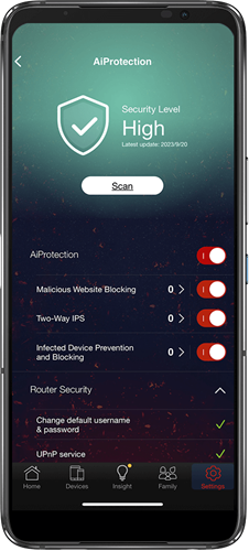 Der ROG Rapture GT-BE98 verfügt über einen unkomplizierten Sicherheitsscan, mit dem du sicherstellen kannst, dass der Router richtig für den Netzwerkschutz konfiguriert ist, einschließlich der WiFi-Passwortstärke für jedes Subnetzwerk, der Portkonfiguration und mehr.