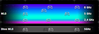 Multi-Link Operation (MLO) ermöglicht es einem Gerät, sich gleichzeitig mit mehreren Frequenzbändern zu verbinden, was höhere Geschwindigkeiten durch die Bündelung der Bandbreite und zuverlässigere WiFi-Verbindungen auf mehreren gleichzeitig genutzten Bändern ermöglicht. Die Verbindung mit mehreren Bändern auf diese Weise ermöglicht auch einen "nahtlosen Wechsel", bei dem deine Daten automatisch dem am besten geeigneten Band zugewiesen werden, um die Latenz zu verringern.