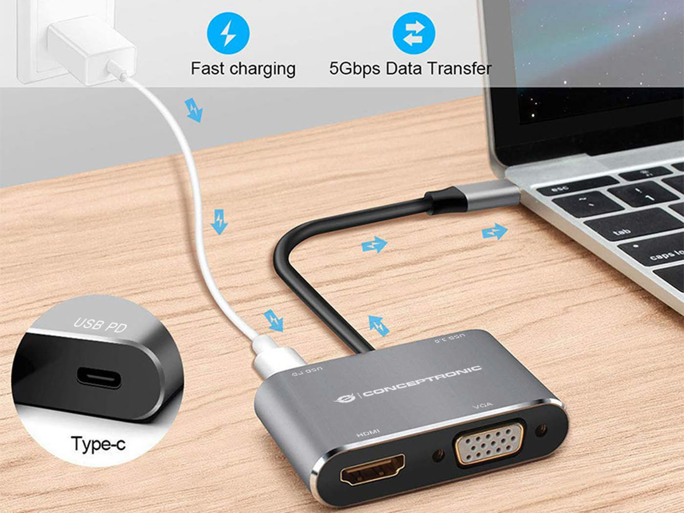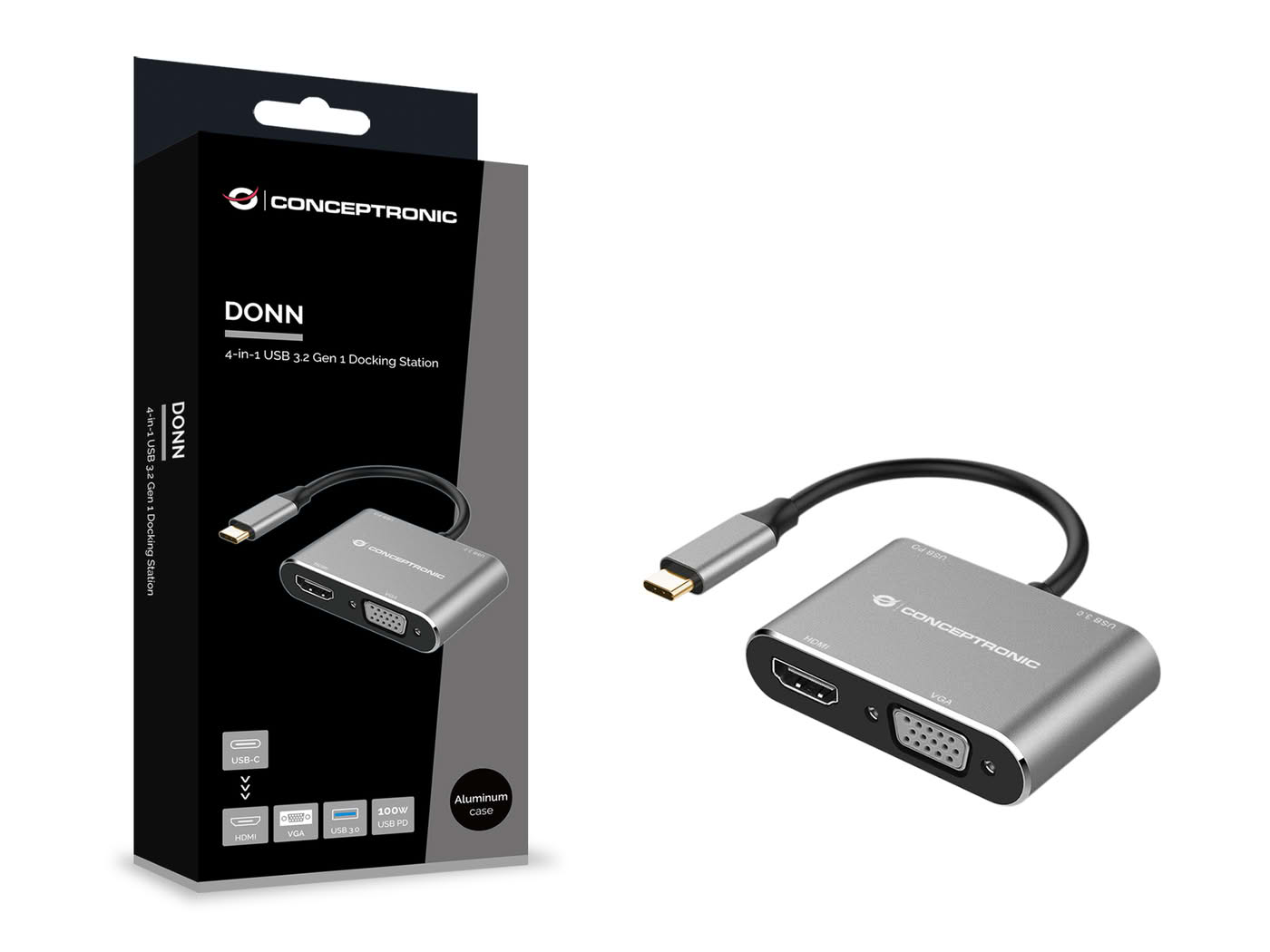 - 4-in-1 USB-Typ-C zu HDMI, VGA, USB-Typ-C PD und USB 3.0 Multiport-Adapter