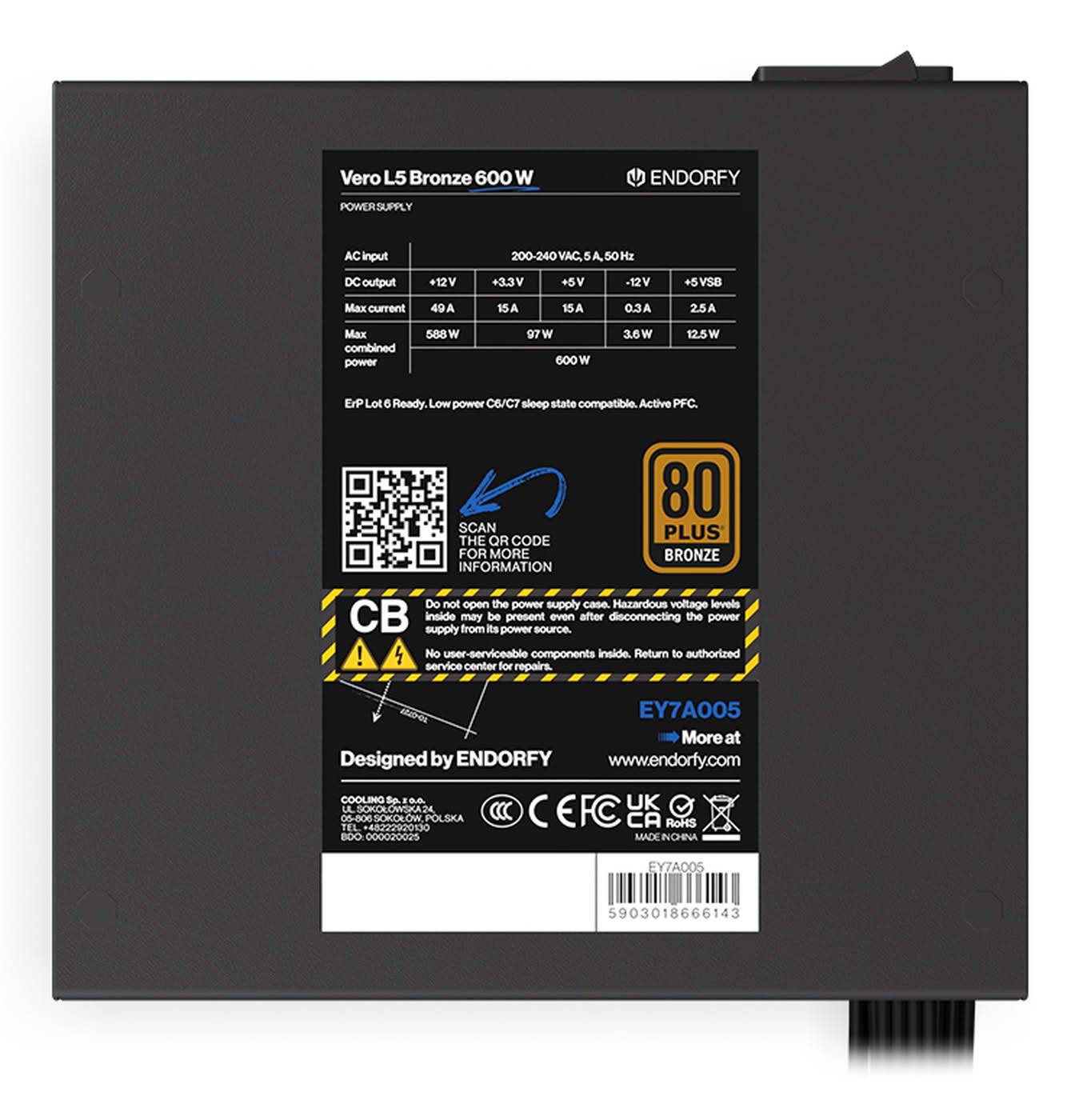 Mit 600 W Gesamtleistung, Eingangsspannung 200-240 V und solide Ausstattung ist das Endorfy Vero L5 Bronze 600 W eine gute Wahl für Mittelklasse-Systeme.