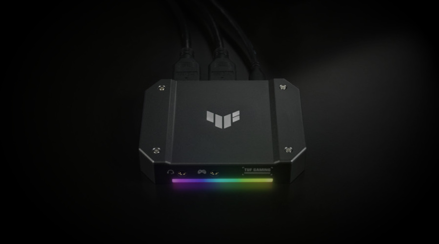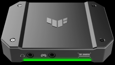 Die Vorderseite der ASUS TUF GAMING CAPTUE BOX-4KPRO wird von einem ARGB Strip beleuchtet, der bequem den Funktionsstatus anzeigt.â