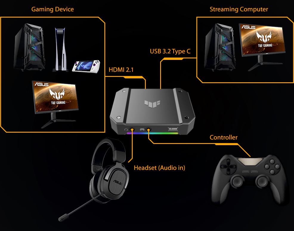 Gaming Device, HDMI 2.1, USB 3.2 Type C, Streaming Computer, Headset (Audio in), Controller