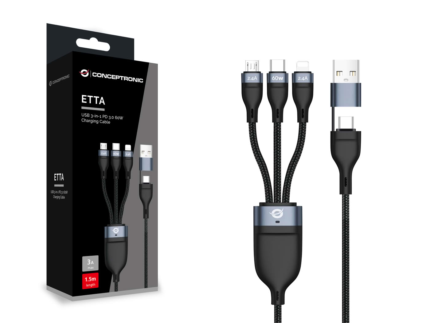 Wir präsentieren das vielseitige Conceptronic 3-in-1 USB-C-Kabel, die ultimative Lösung für all Ihre Lade- und Synchronisierungsbedürfnisse! Dieses Kabel kombiniert USB-C zu MicroUSB, USB-C und Lightning-Anschlüsse in einem schlanken Design. Mit PD 3.0-Technologie liefert es bis zu 60W (20V/3A) für schnelles Aufladen. Das robuste geflochtene Kabel ist darauf ausgelegt, Drehungen und Ziehen standzuhalten und ist somit eine zuverlässige Wahl für enge Räume oder den mobilen Einsatz. Sagen Sie Tschüss zu verknoteten Kabeln und vereinfachen Sie Ihr Konnektivitätserlebnis mit unserem 3-in-1-Kabel!