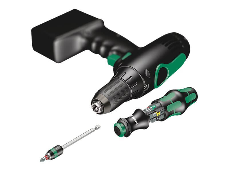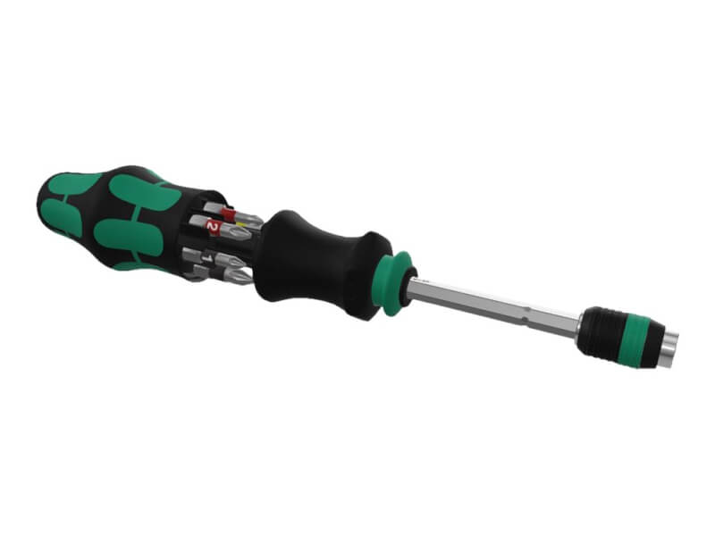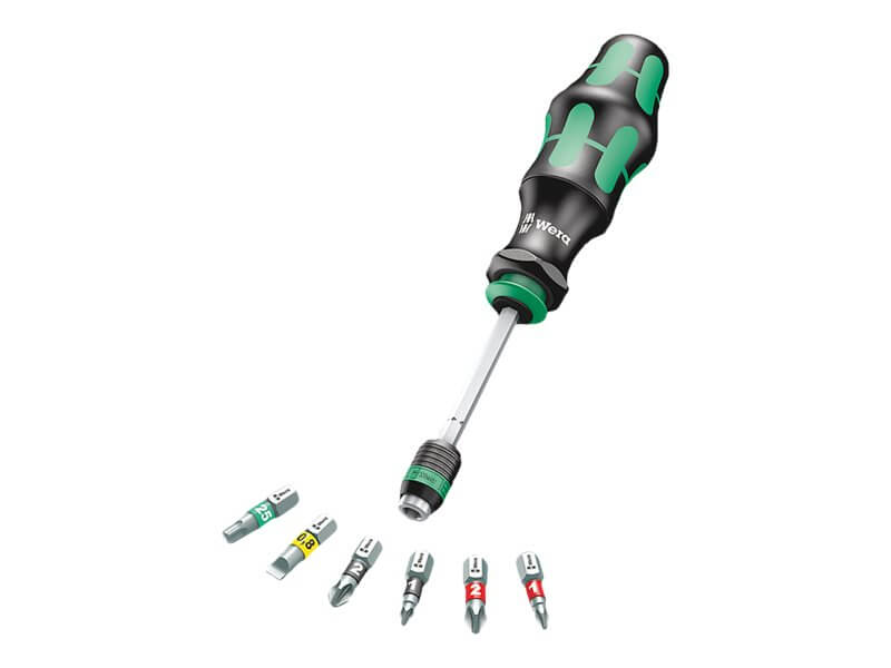 Ergonomischer Griff, Schnellverschlussmechanismus, teleskopisch, farblich codierte Bits, Schnellwechsel-Bithalter, Handhalter mit Abrollschutz, Rapidaptor-Technologie