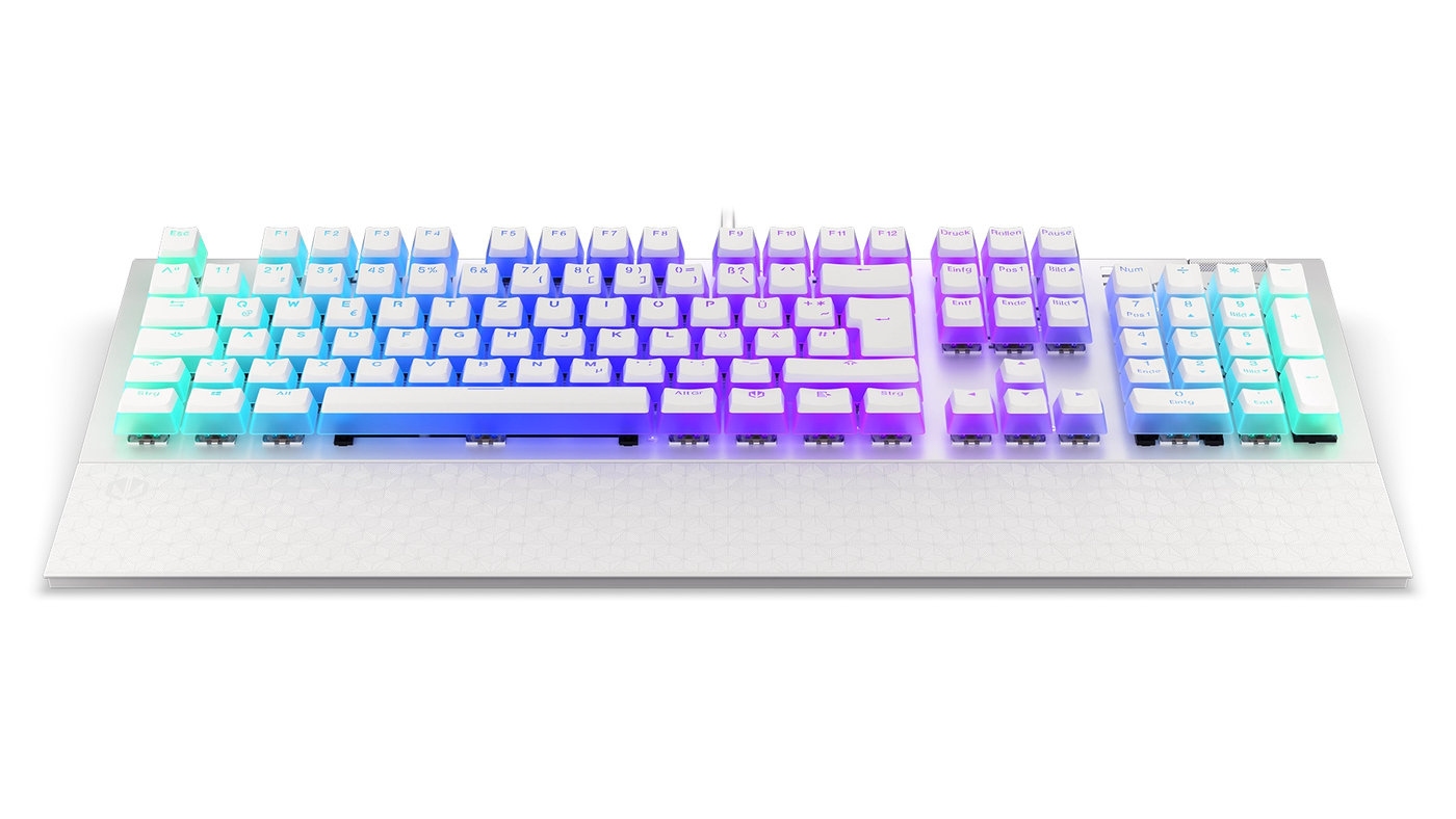 ENDORFY Omnis. Tastatur Formfaktor: Volle Größe (100%). Tastatur-Stil: Gerade. Übertragungstechnik: Kabelgebunden, Geräteschnittstelle: USB, Tastatur-Switch: Mechanischer Switch, Tastatur - Tastenanzahl: 104. Typ der Hintergrundbeleuchtung: RGB-LED, Handgelenkauflage. Kabellänge: 1,8 m. Empfohlene Nutzung: Gaming. Produktfarbe: Weiß