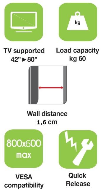 - Techly ICA-PLB-860. Höchstgewichtskapazität: 60 kg, Minimum Bildschirmgröße Kompatibilität: 106,7 cm (42 Zoll), Maximaler Bildschirmdurchmesser: 2,03 m (80 Zoll), Minimale VESA-Halterung: 800 x 600 mm, Maximale VESA-Halterung: 800 x 600 mm. Abstand zur Wand (max): 1,6 cm. Produktfarbe: Schwarz