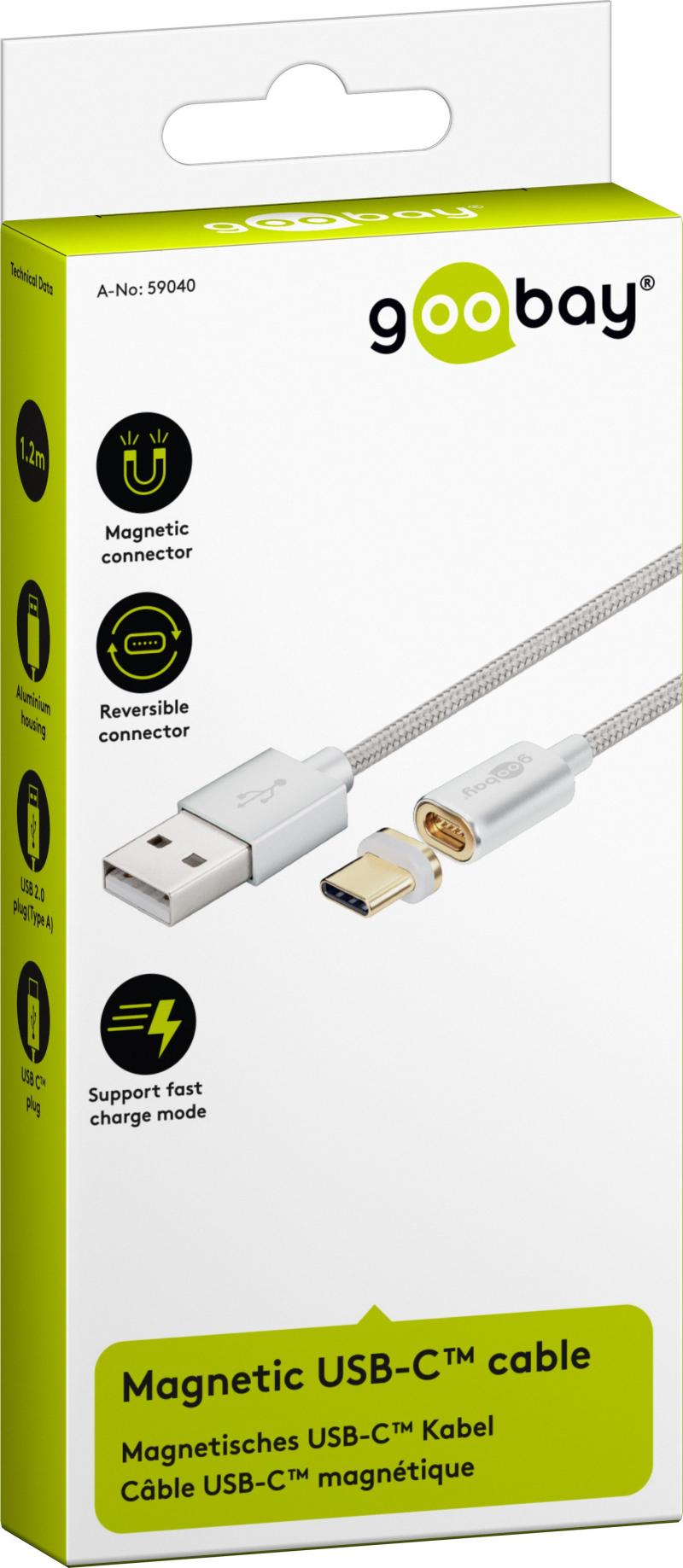 - Goobay 59040. Kabellänge: 1,2 m, Anschluss 1: USB C, Anschluss 2: USB A, USB-Version: 2.0, Steckerverbindergeschlecht: Männlich/Männlich, Produktfarbe: Weiß