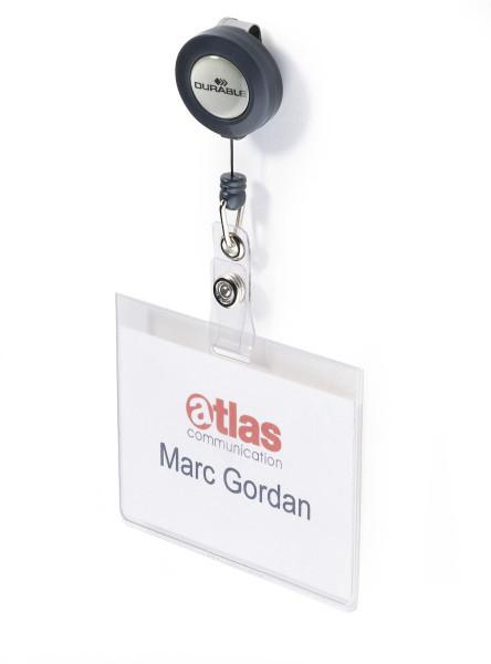 Das Namensschild aus hochtransparenter Hartfolie wird an einem Jojo mit Aufrollmechanismus... mehr