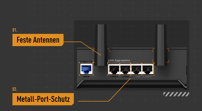 Der TUF Gaming AX4200 kann bis zu 2 Gbit/s Internetbandbreite über den 2,5 Gbit/s-Port freischalten und zwei separate 1 Gbit/s-Internetdienste über die LAN1- und LAN2-Ports aggregieren.* *Link Aggregation (802.3ad) bezieht sich auf die Kombination des Durchsatzes mehrerer Geräte.