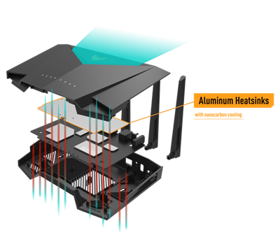 Der TUF Gaming AX4200 wurde entwickelt, um maximale Wi-Fi-Leistung zu liefern. Die Belüftungsöffnungen und das Design des Kühlkörpers verbessern die Kühlung und sorgen für mehr Stabilität.