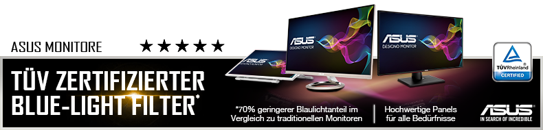 Der vom TÜV Rheinland zertifizierte ASUS Blue-Light-Filter schützt den Nutzer vor gesundheitsschädlichem, blauem Licht und verfügt über vier verschiedene Filtereinstellungen, auf die per Hotkey zugegriffen werden kann. ASUS-Monitore werden besonders strengen Performance-Tests unterzogen und verfügen über Technologien zur Vermeidung von Bildflimmern und zur Reduzierung des Blaulichtanteils. Diese Technologien wurden vom TÜV Rheinland zertifiziert, einem weltweiten Anbieter von Technik-, Sicherheits- und Zertifizierungsdiensten