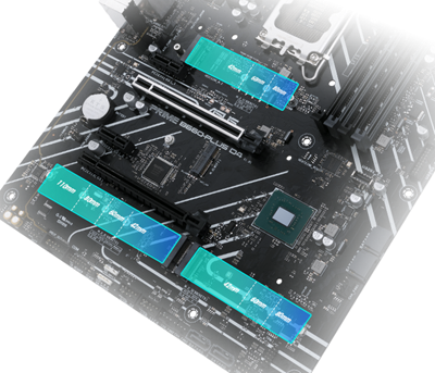 Das Prime B660-PLUS D4 bietet insgesamt drei M.2-Steckplätze, die Datenübertragungsgeschwindigkeiten von bis zu 64 Gbit/s über PCIe® 4.0 unterstützen und so schnellere Boot- und Ladezeiten für Betriebssysteme und Anwendungen ermöglichen.