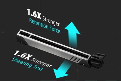 SafeSlot Core+ ist der ASUS-exklusive PCIe-Steckplatz, der mit einer einteiligen Edelstahlstrebe verstärkt ist, die den Steckplatz vor Schäden schützt. Die Metallabdeckung ist mit Haken fest im Steckplatz befestigt und die gesamte Baugruppe ist mit verstärkten Lötpunkten fest auf der Platine verankert, um eine sichere Grundlage für schwergewichtige Grafikkarten zu bieten.