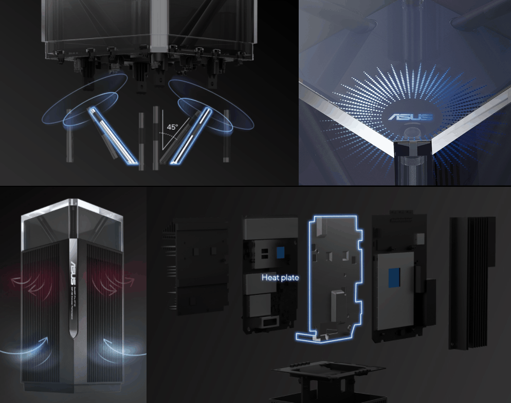 ZenWiFi Pro ET12 wurde entwickelt, um maximale WLAN-Leistung zu liefern - mit einem um bis zu 18 %* verbesserten Durchsatz - dank des neuesten Broadcom WiFi-Chipsatzes und der CPU. Die acht externen Antennen sind sorgfältig in dem speziellen transparenten Fach auf der Oberseite des Routers angeordnet und abgewinkelt, um Interferenzen zu minimieren und die Signalabdeckung zu maximieren. *Die Daten werden mit denen der früheren WiFi 6-Plattform verglichen.