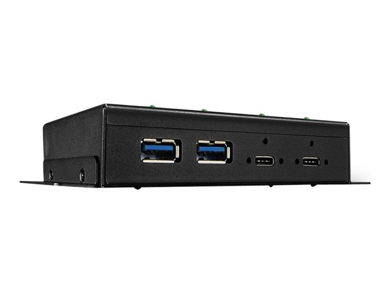 Alle Typ C-Buchsen des Hubs erlauben den Anschluss von verschraubbaren USB 3.1 Kabeln, die mit der 'USB-IF Type C Locking Specification' kompatibel sind. Jeder USB Port ist einzeln kurzschlussgeschützt und alle vier USB Ports unterstützen den Battery Charging Standard 1.2 mit einer Gesamtladeleistung von 17,5 Watt. Der Hub kann über das beiliegende Netzteil oder den Terminal Block mit Strom versorgt werden, sodass eine sichere, stabile Stromversorgung gewährleistet wird.