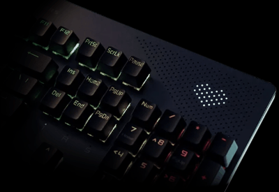 Die abnehmbare Handgelenkauflage hat einen eingebauten Lichtdiffusor, der sie zum Leuchten bringt, wenn sie mit der Tastatur verbunden ist.