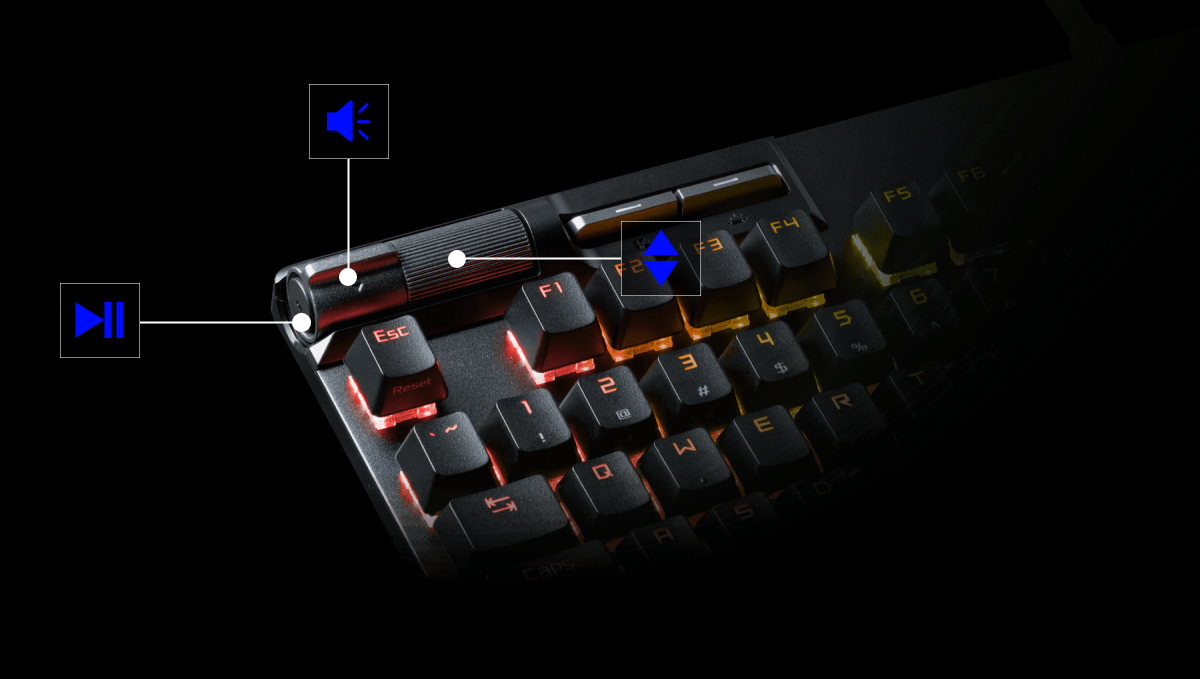 Die Metalltasten für die Mediensteuerung sind so angeordnet, dass sie direkt in deiner Hand liegen und als Hotkeys programmiert werden können. Drehe das Scrollrad, um die Lautstärke zu regeln oder den Ton stumm zu schalten, und benutze den Drehknopf, um Titel zurückzuspulen oder zu überspringen, zu pausieren oder abzuspielen.
