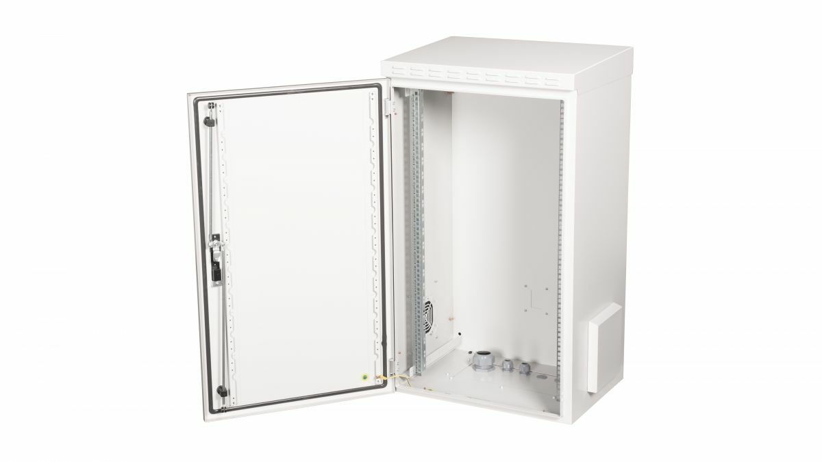 Die Schrankserie "Safe Outdoor" repräsentiert 483 mm (19") IP55 Wandschränke für den Außenbereich, die für den industriellen Einsatz konzipiert wurden. Sie entsprechen der Schutzart IP55 nach EN 60529 und bieten Schutz gegen das Eindringen von Wasser und Schmutz. Für erhöhte Sicherheit sorgt ein 3-Punkt-Verriegelungssystem, das durch einen abschließbaren Schwenkhebelgriff und isolierte Kabeleinführungen ergänzt wird. Die Schränke verfügen außerdem über integrierte Lüftungsschlitze für die Frischluftzirkulation und bieten Schutz gegen Wasser und Staub gemäß IP54. Diese Schränke sind ideal für Standorte, die Umwelteinflüssen wie Regen, Staub, Graupel, Schnee und Spritzwasser ausgesetzt sind. Für mehr Flexibilität können diese Schränke mit einem Sockel kombiniert werden, um sie freistehend aufzustellen. Bei Verwendung des Sockels können die rückseitigen Montageöffnungen mit Stopfen aus dem Schranksockel verschlossen werden.