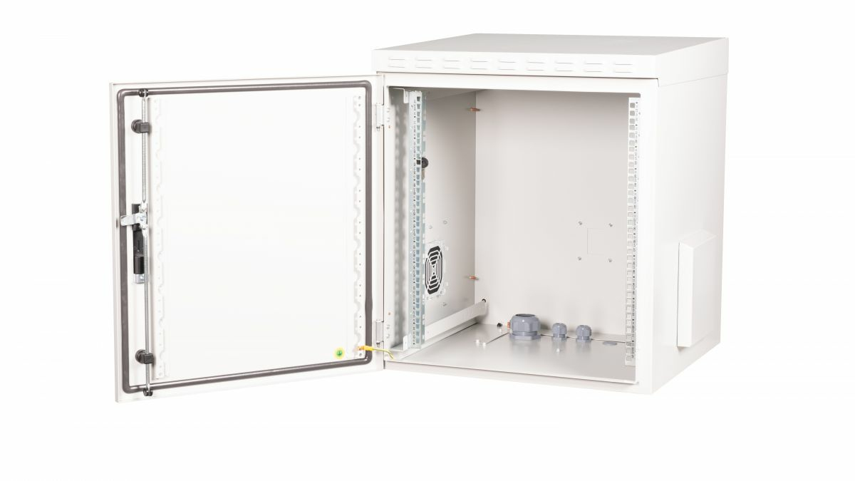 Die Schrankserie "Safe Outdoor" repräsentiert 483 mm (19") IP55 Wandschränke für den Außenbereich, die für den industriellen Einsatz konzipiert wurden. Sie entsprechen der Schutzart IP55 nach EN 60529 und bieten Schutz gegen das Eindringen von Wasser und Schmutz. Für erhöhte Sicherheit sorgt ein 3-Punkt-Verriegelungssystem, das durch einen abschließbaren Schwenkhebelgriff und isolierte Kabeleinführungen ergänzt wird. Die Schränke verfügen außerdem über integrierte Lüftungsschlitze für die Frischluftzirkulation und bieten Schutz gegen Wasser und Staub gemäß IP54. Diese Schränke sind ideal für Standorte, die Umwelteinflüssen wie Regen, Staub, Graupel, Schnee und Spritzwasser ausgesetzt sind. Für mehr Flexibilität können diese Schränke mit einem Sockel kombiniert werden, um sie freistehend aufzustellen. Bei Verwendung des Sockels können die rückseitigen Montageöffnungen mit Stopfen aus dem Schranksockel verschlossen werden.