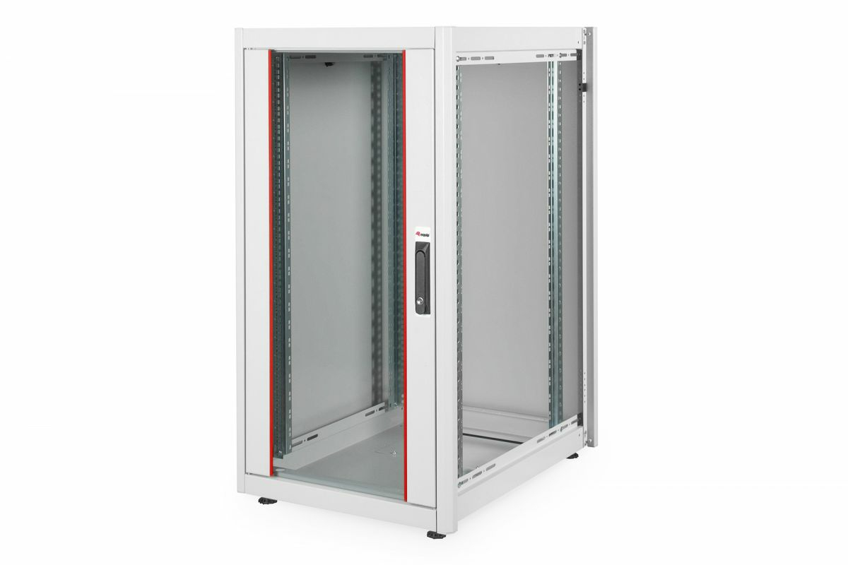 Die Schränke der Basic Flex Line wurden für die effiziente und benutzerfreundliche Installation von aktiven und passiven Netzwerkkomponenten entwickelt, wobei der Schwerpunkt auf einem rationellen Kabelmanagement liegt. Hergestellt aus bis zu 1,5 mm starkem Stahlblech, garantiert jeder Schrank eine hervorragende Stabilität durch eine einzigartige, die einen robusten Stahlrahmen bildet. Sie sind pulverbeschichtet in Grau (RAL 7035) oder Schwarz (RAL 9005)erhältlich. Für schwer zugängliche Aufstellorte ist der Schrank zerlegbar ausgeführt. Die Türen sind leicht abnehmbar und die Türanschläge können zwischen Rechts- und Linksanschlag umgeschaltet werden. Außerdem ist das Dach für den Einbau einer Lüftungseinheit vorbereitet. In jedem Schrank befinden sich zwei Sätze (4 Stück) 483-mm-Profilschienen (19"). Diese verzinkten und mit beidseitig ablesbaren Höheneinheiten versehenen Schienen sind in der Tiefe verstellbar. Um den Einbau von großvolumigen Geräten zu erleichtern, werden sie mit zusätzlichen Tiefenstreben kombiniert. Das Kabelmanagement ist ein zentraler Bestandteil des Designs. Der Schrankboden verfügt über eine ausgestanzte Kabeleinführung, die mit einer Metallplatte abgeschirmt ist. Für die breiteren 800 mm Schränke gibt es zusätzlich ausgestanzte Kabeleinführungen, die beidseitig mit Kunststoff abgedeckt sind. Diese Kabeleinführungen befinden sich auch auf dem Dach, wobei bei den 600 mm breiten Schränken nur eine und bei den 800 mm breiten Schränken drei Kabeleinführungen gibt. Um den unterschiedlichen betrieblichen Anforderungen gerecht zu werden, ist ein umfangreiches Zubehörprogramm mit Kabelführungswerkzeugen und Fachböden erhältlich.