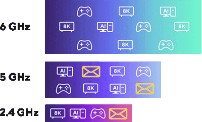 Im Vergleich zu 1024-QAM mit Wi-Fi 6/6E kann jedes Signal mit 4096-QAM größere Datenmengen dichter zusammenfassen, was eine bis zu 20%* effizientere Datenübertragung ermöglicht. *Im Vergleich zu Wi-Fi 6/6E 1024-QAM