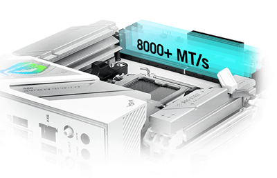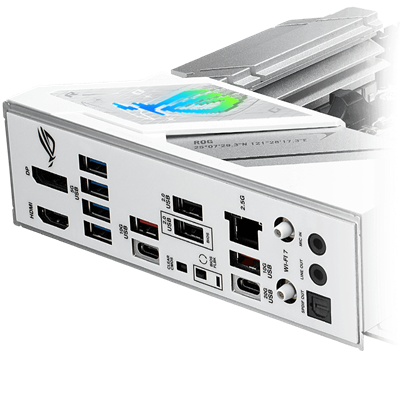 Das ROG Strix B860-A hat ein klares, weißes Design, das zu jedem Gebäude passt. Die passenden Metallkühlkörper unterstreichen den eleganten Look, während die Aura Sync RGB-Beleuchtung anpassbare Effekte für einen subtilen oder gewagten Stil bietet.