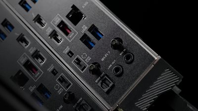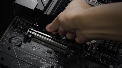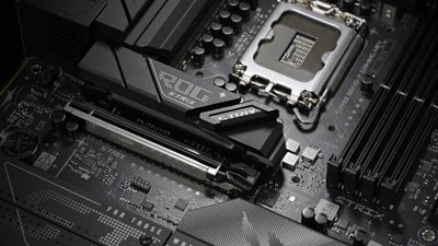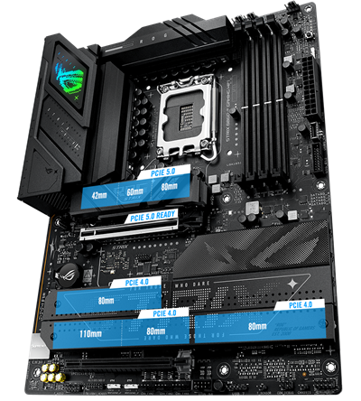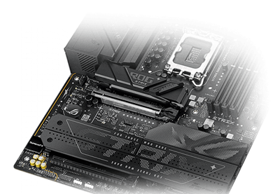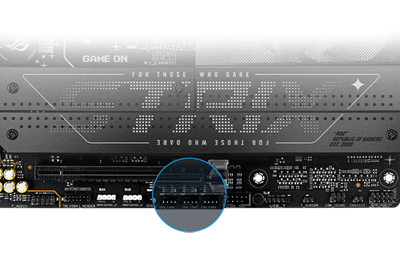 Das Strix B860-F bietet durchgängige PCIe 5.0-Unterstützung und der oberste x16-Erweiterungssteckplatz ist mit einer SafeSlot-Halterung geschützt, um das Gewicht der neuesten Grafikkarten zu tragen. Ein integrierter M.2-Steckplatz ist für rasante Lese- und Schreibgeschwindigkeiten von bis zu 16 GB/s ausgelegt, während die übrigen Steckplätze immer noch beeindruckende 8 GB/s übertragen können. Und jeder M.2-Steckplatz ist mit massiven Kühlkörpern ausgestattet, um die Wärme der Next-Gen-Laufwerke abzuleiten.