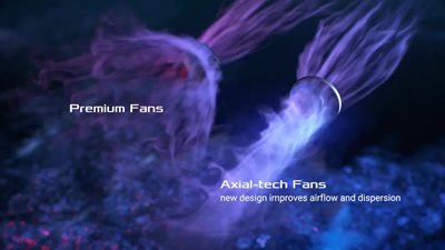 Die drei bewährten Axial-Tech-Lüfter verfügen über eine kleinere Nabe, die längere Flügel ermöglicht, und einen Sperrring, der den Luftdruck nach unten erhöht und so für niedrigere Temperaturen, weniger Lärm und höhere Leistung sorgt