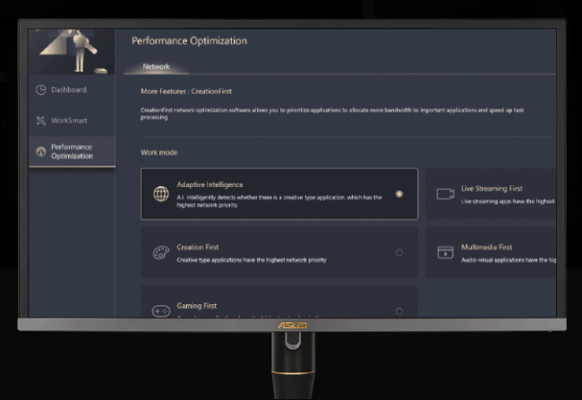 CreationFirst ist eine Anwendung zur Netzwerkoptimierung, die in ProArt Creator Hub integriert ist und fünf Netzwerkmodi zur Optimierung der Bandbreiteneffizienz für verschiedene Aufgaben bietet.